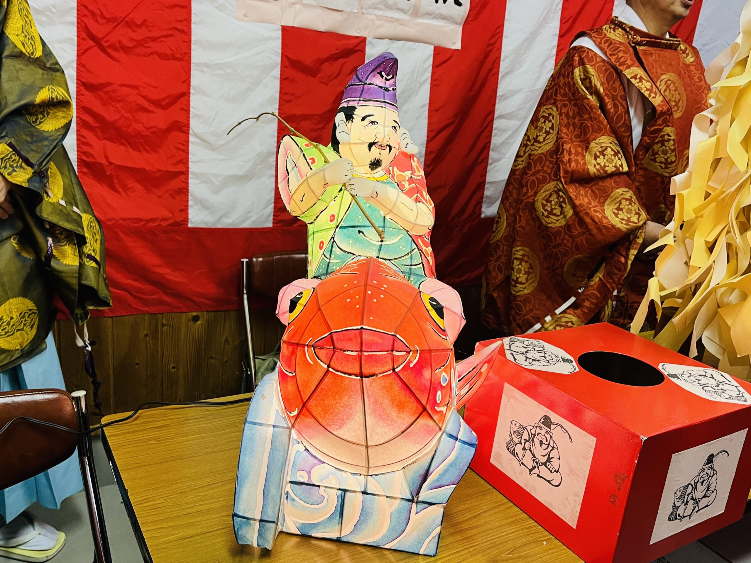 えべっさんに見守られて、山口のかまぼこと地元のお酒のおみやげをいただいて、くじ引きをして、大麻(おおぬさ)でお祓いを受けて、最後に参加者全員で三本締めの手拍子を響かせました。