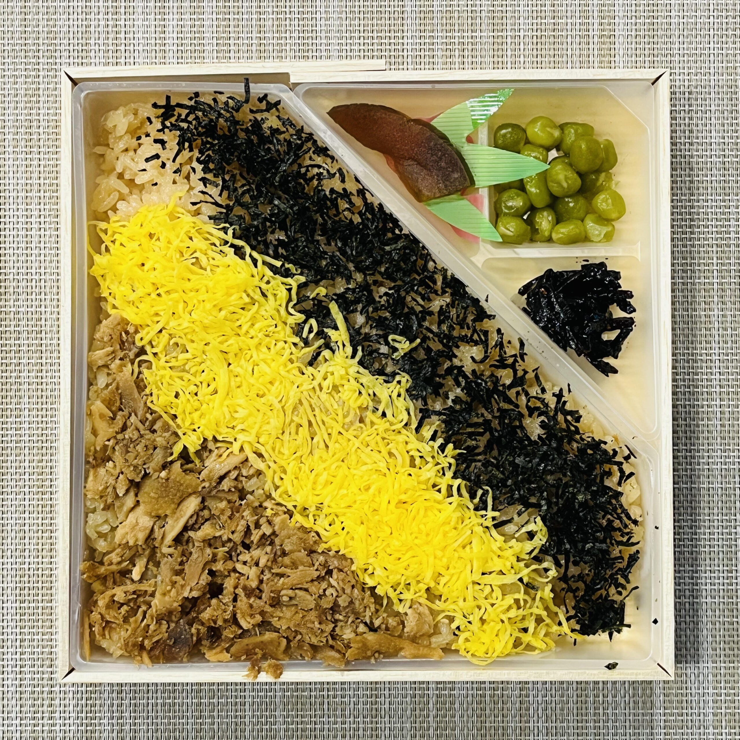 かしわめしは、鶏肉と鶏ガラでスープをとり、それで炊き込んだご飯の上に甘辛く炊き込んだお肉、錦糸卵、刻みのりをトッピングしたお弁当です。