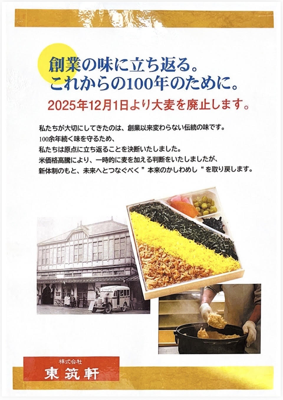 今年3月から、米価高騰の影響で大麦1割をブレンドされていましたが、12月1日から、かしわめしの「大麦入り」炊き込みご飯を、創業の味であるうるち米のみに戻されたそうです(上図参照)。