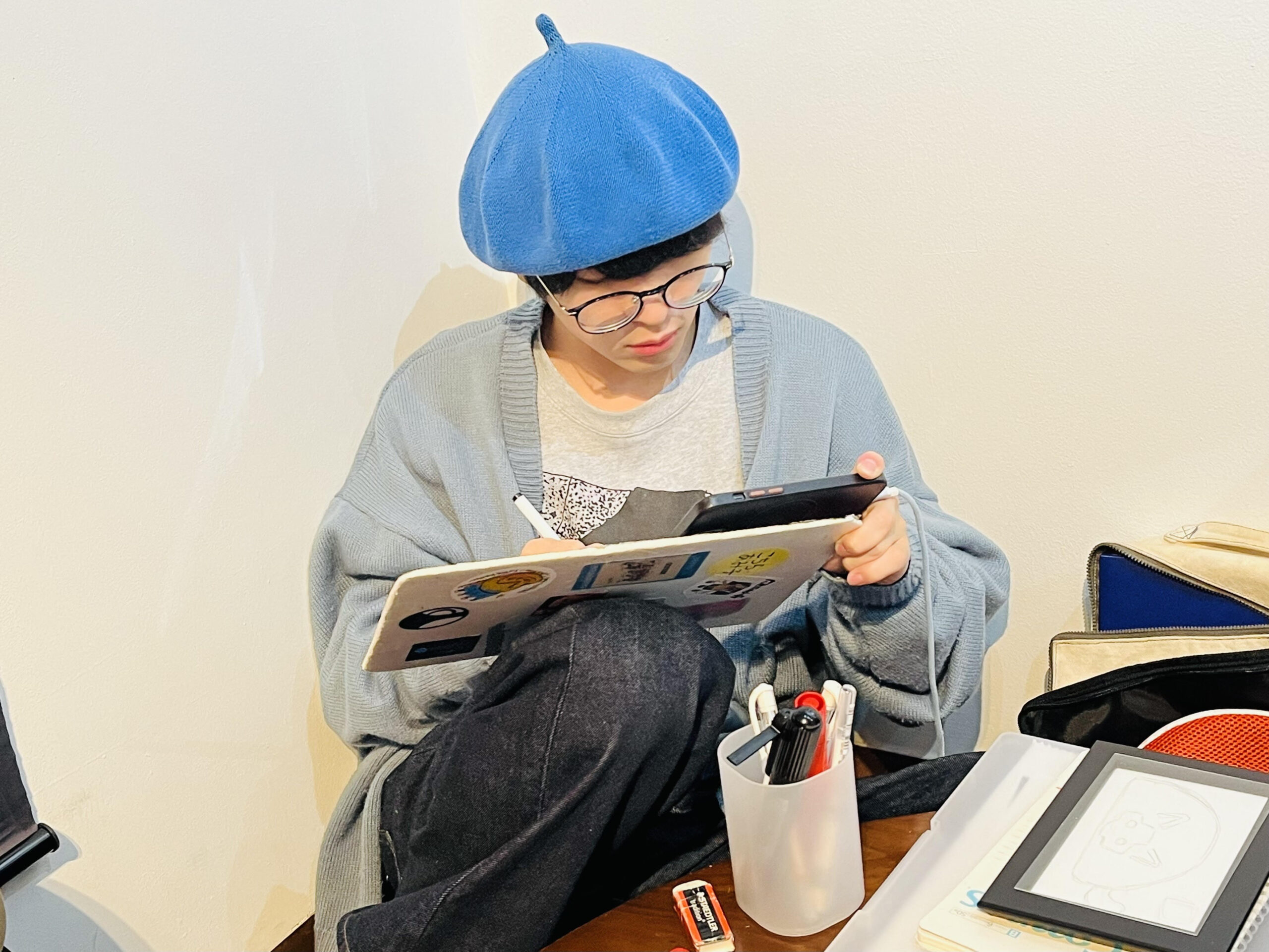来場者の似顔絵を制作中の福岡市の画家奥村門土さん(モンドくん)